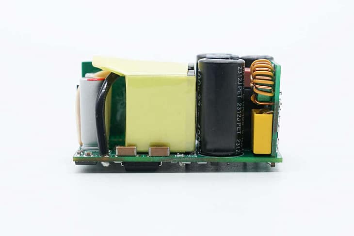 PCBA module front view showing the left soldering of input board, right soldering of high-voltage filter capacitors, and the middle being a transformer. The right side is output filter capacitors and USB-C socket board.