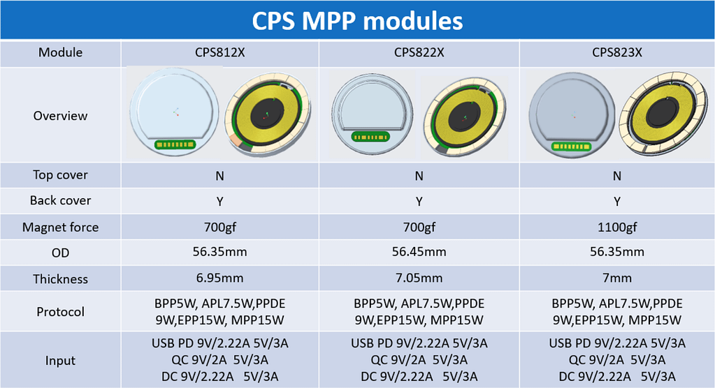 Currently, EasyCharge has launched three MPP transmitter modules, namely CPS812X, CPS822X, and CPS823X. Among them, the module sizes of CPS822X and CPS823X are 基本一致 with those of Apple’s C222X and C223X, respectively, which can meet the needs of customers to avoid re-tooling and quickly bring their products to market.