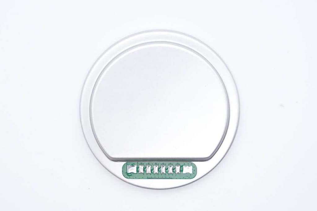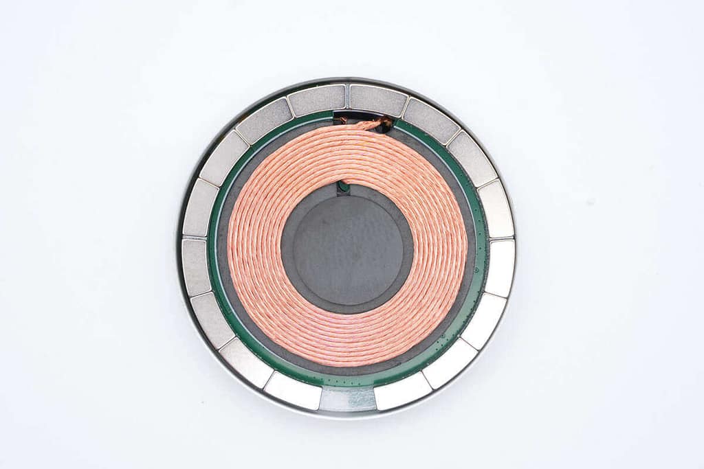 The front of the EasyCharge CPS812X wireless charging module is designed without a cover, with a coil set in the center and a circle of magnets around the edge used for (charging).