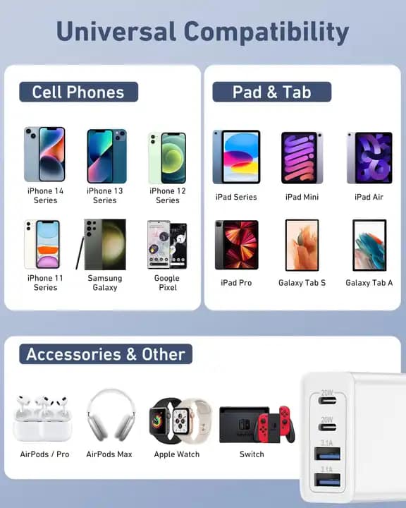 - 【Universal Compatibility】:Due to the special 4-port,the USB charger is compatible with almost all electronic devices,charging adapter for iPhone 14/14 Pro/14 Pro Max/13/13 Mini/13 Pro Max/12/12 Pro Max/12 Pro Max/12 Mini/SE 2020/11/11 Pro/11 Pro Max/XR/XS/X/8/7,iPad Air/Pro/Mini,Samsung Galaxy S22/S21/S20/S10/S9/S8/A12/A13/A22/A32/A52/A53/A71/Note 20 10,Tablets,LG,Motorola,Google Pixel and other digital devices compatible.