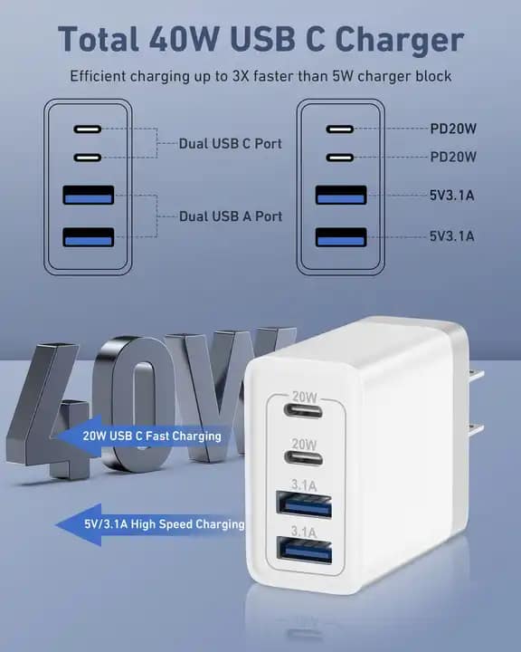 - The USB C Charger supports the Power Delivery and Quick Charge 3.0 fast charging functions with a total power of up to 40W.The USB-A port offers an output power of 3.1 A/5 V,while the USB-C port offers a charging speed of 20W.Charge your iPhone devices from 0% to 58% in just 30 minutes.